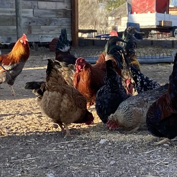 Led by Red, our gentle rooster who loves to be held, these cold-hardy ladies live in the lap of luxury in the Chicken Palace. Many were hatched right here on the farm, making them the true heart of the homestead.